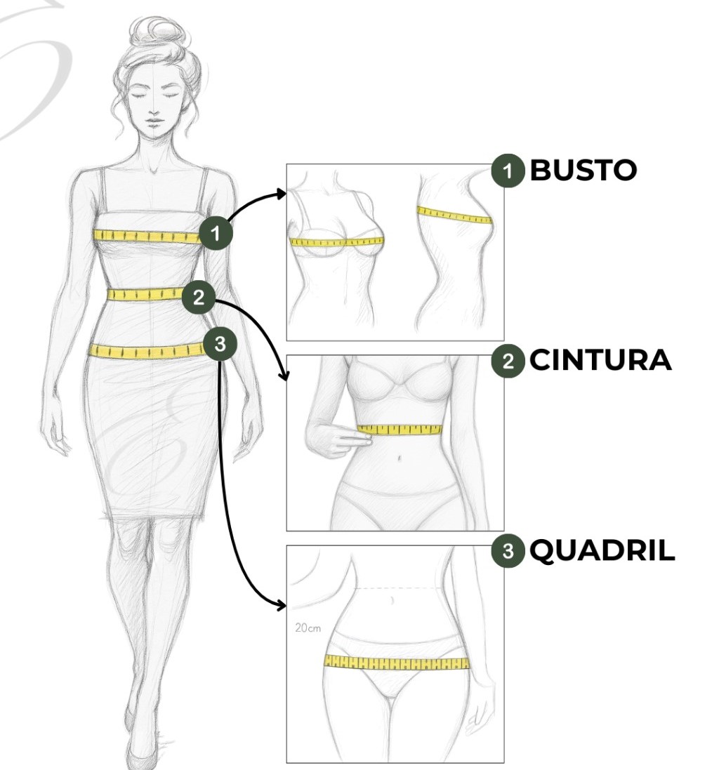 Fazemos questão de destacar que, caso você queira garantir mais segurança e menos chances de erros, você pode deixar suas medidas em cm (busto, cintura, quadril) em "observações finais", na etapa final da compra.